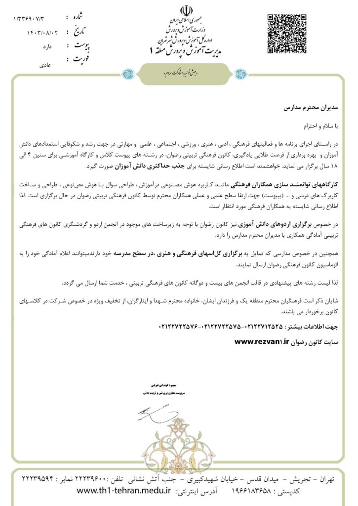 برای کسب اطلاعات بیشتر و شرکت در مسابقه به سایت کانون فرهنگی تربیتی رضوان به آدرس www.Rezvan1.ir مراجعه فرمایید.